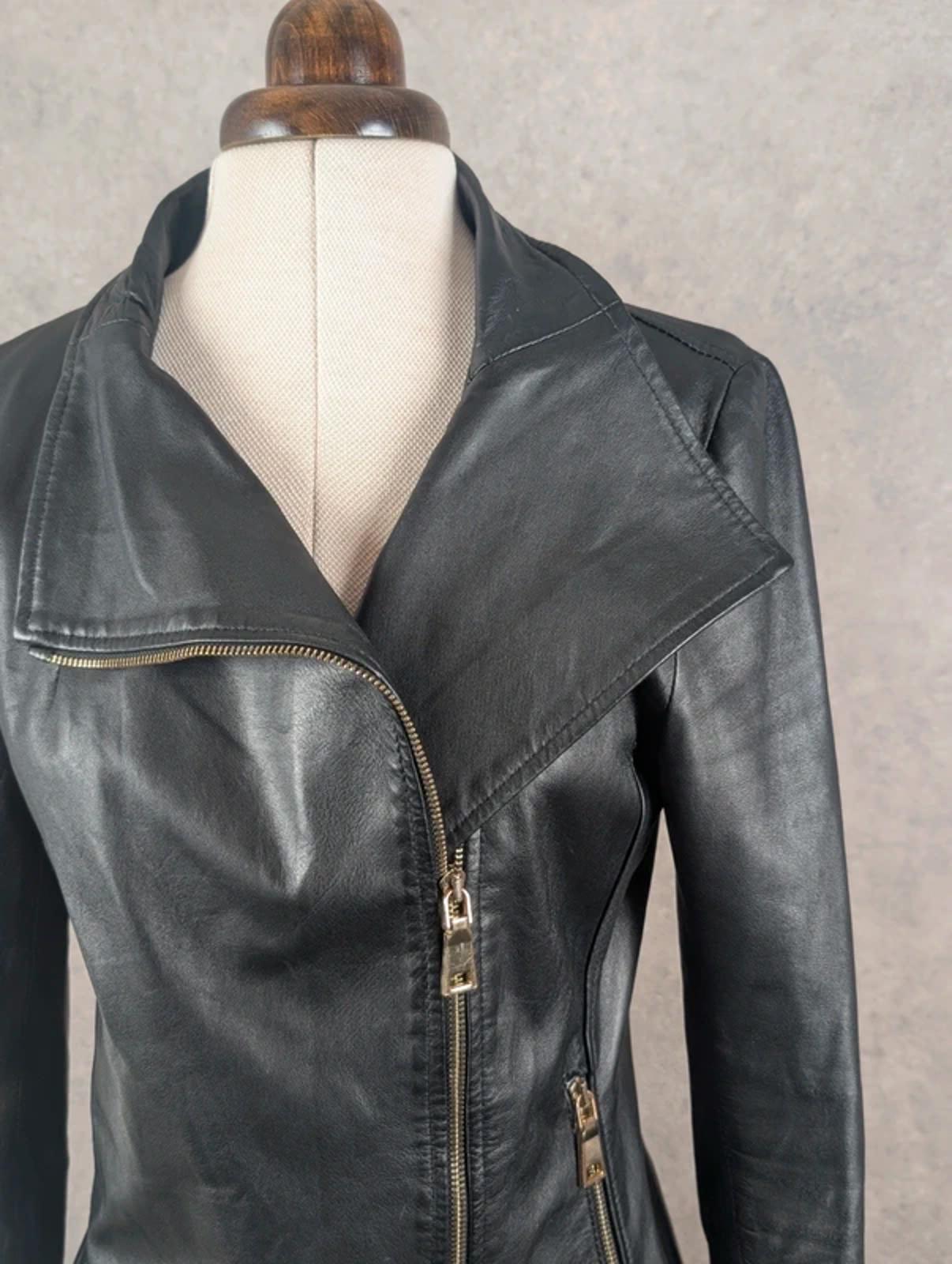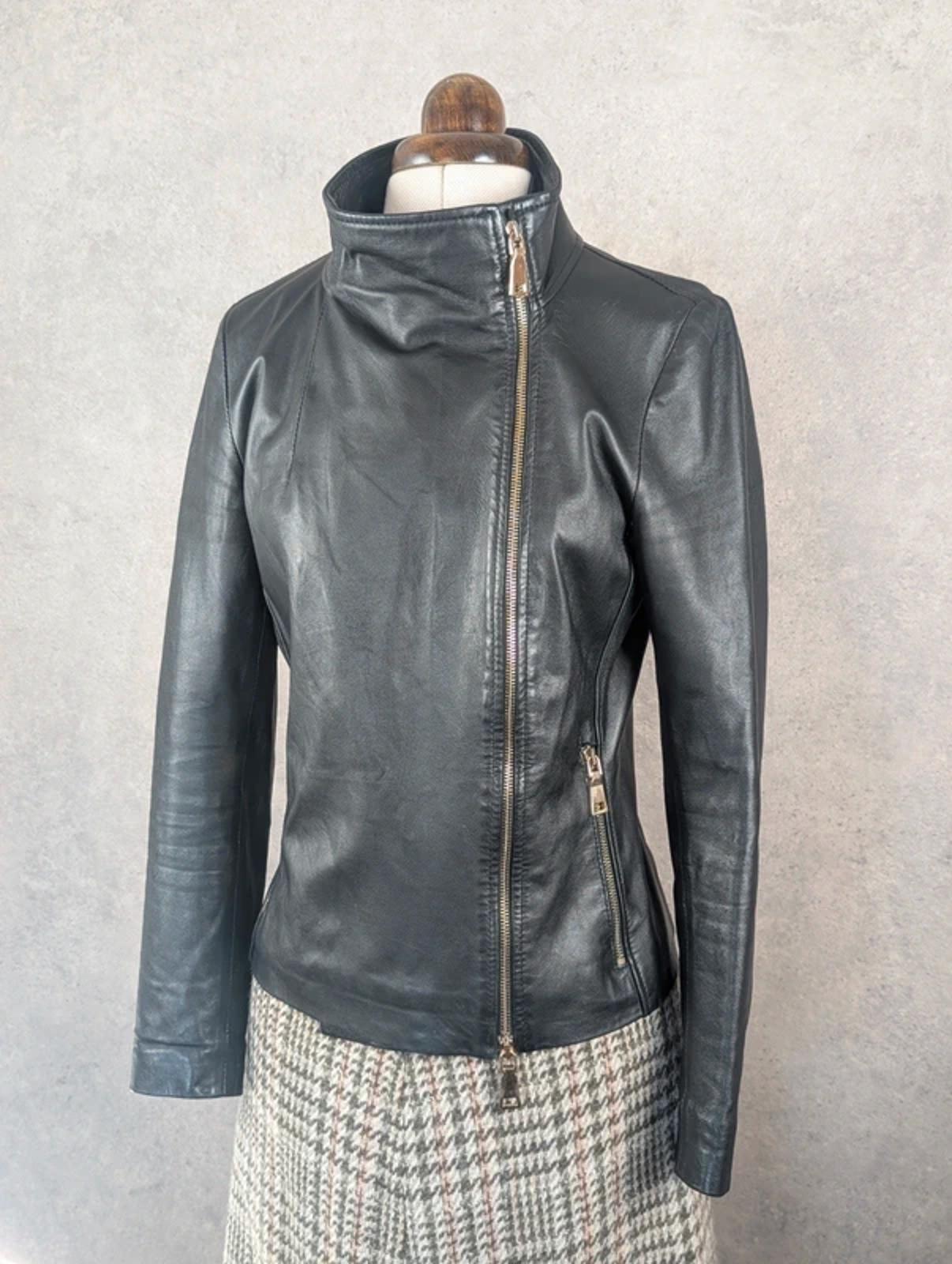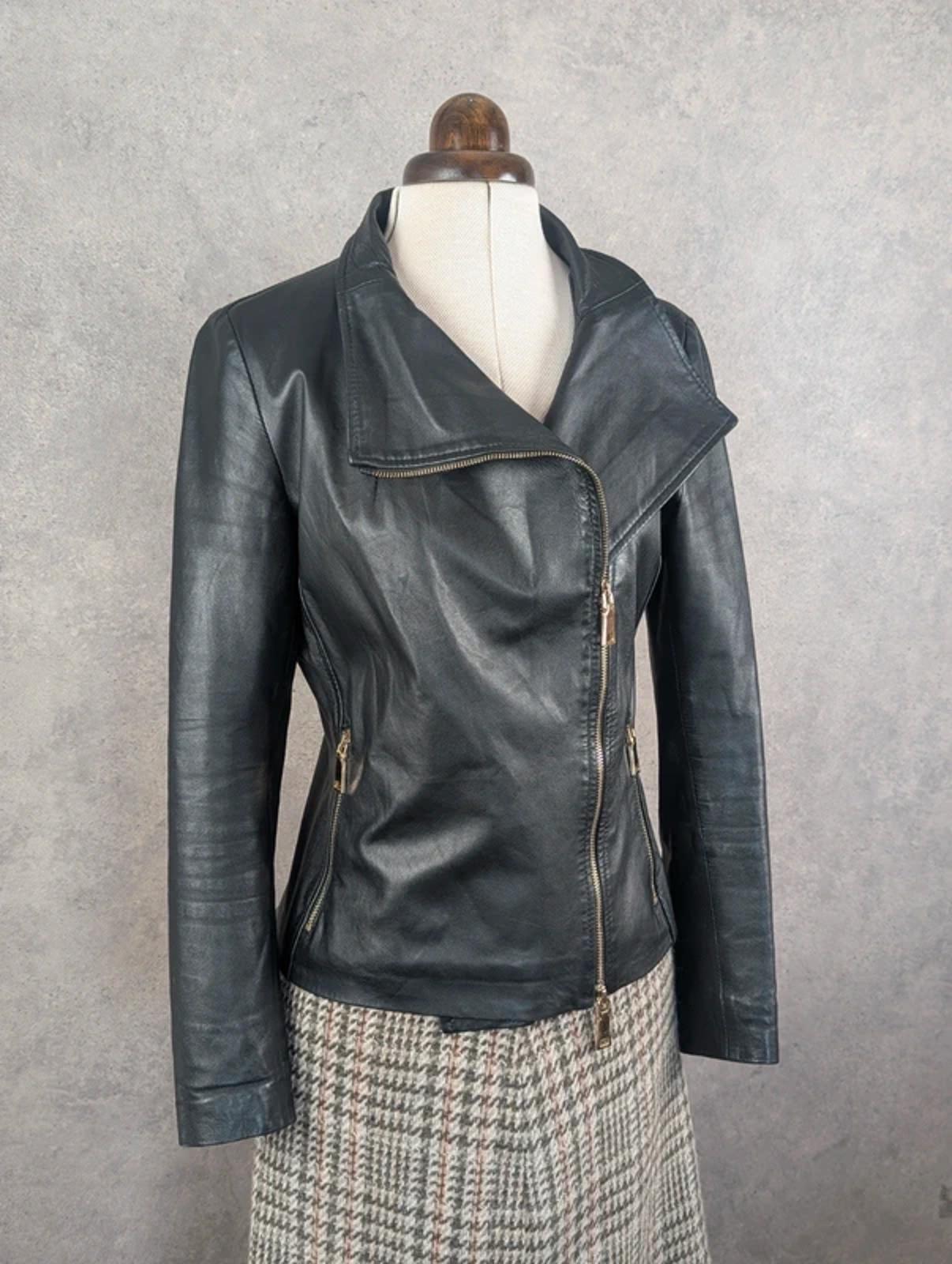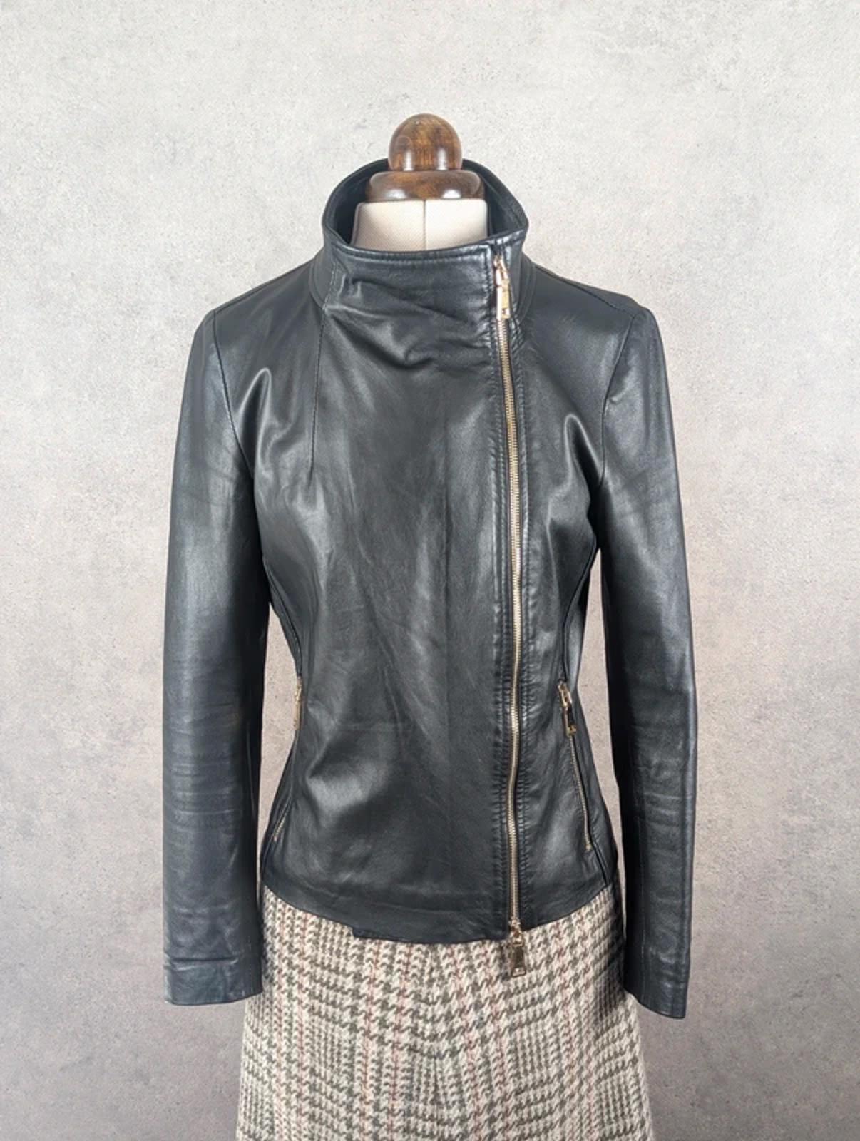 Material: Genuine leather Made in Italy Asymmetric zip front Gold-tone zips and hardware Fitted, tailored shape Fully lined Pre-loved in good condition with a small bit of damage as shown