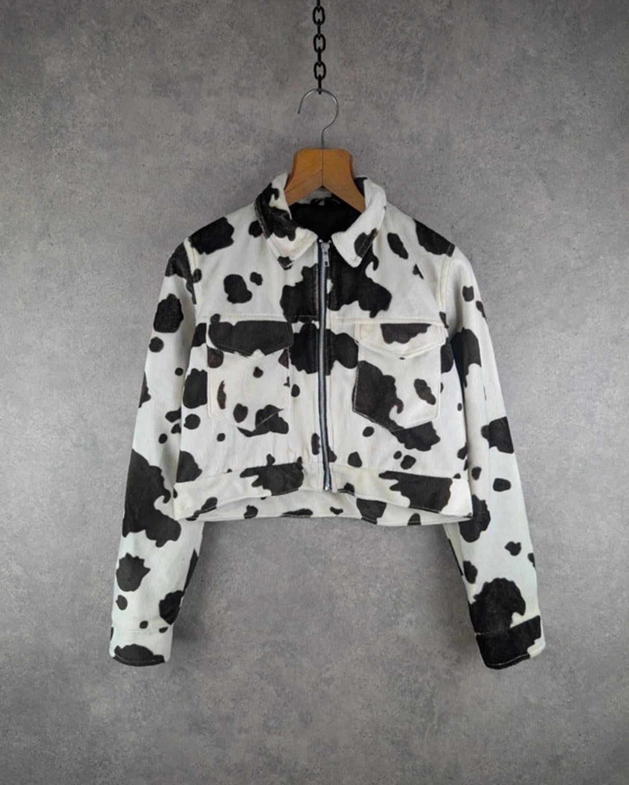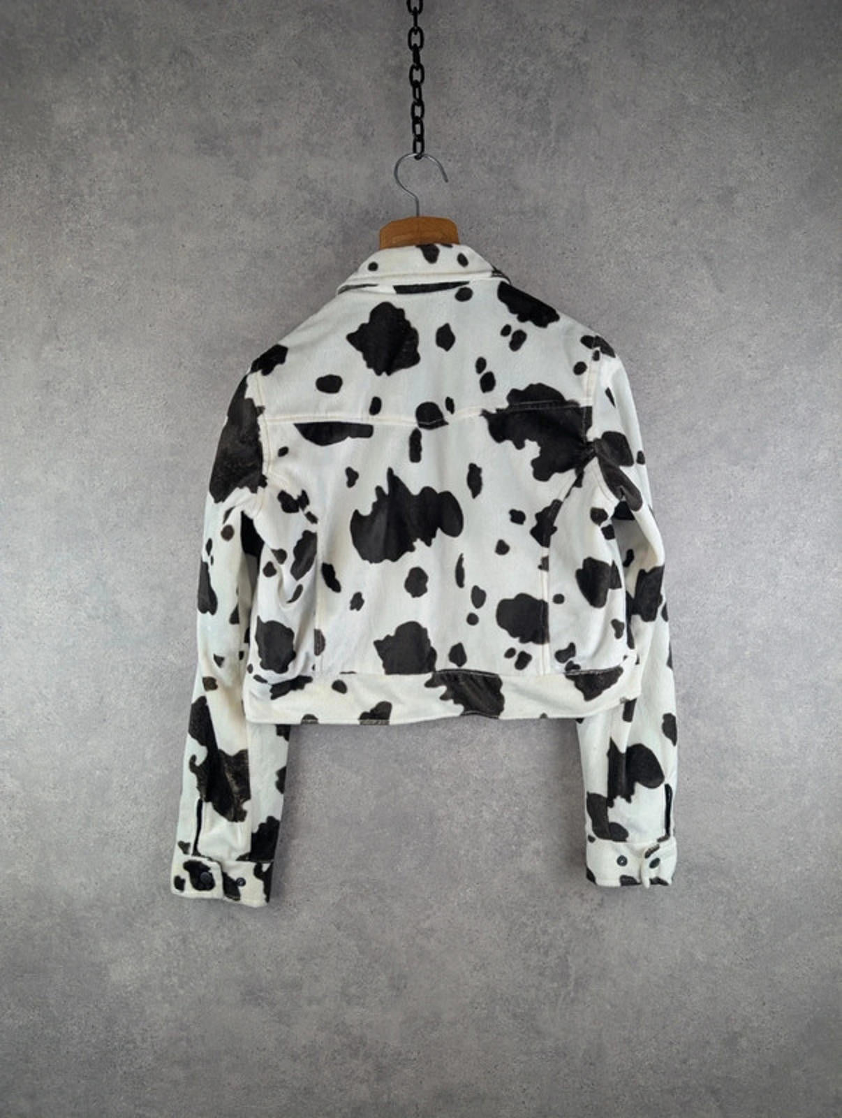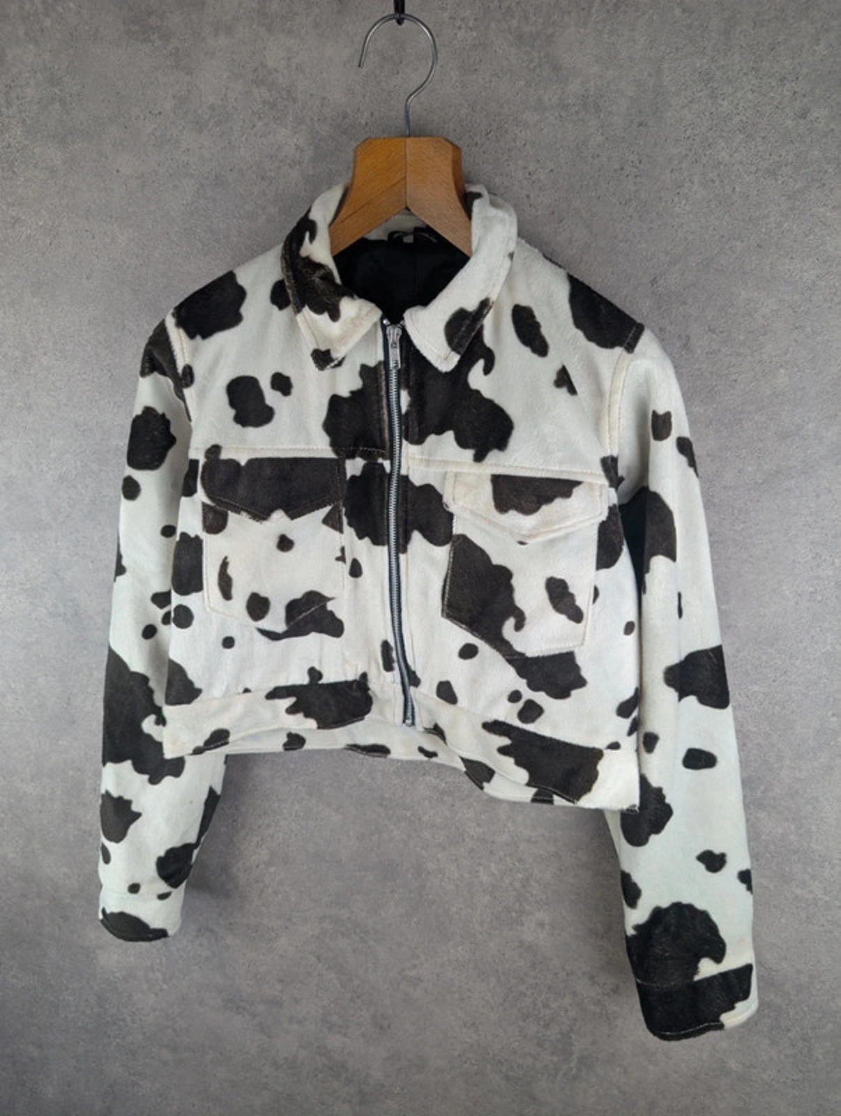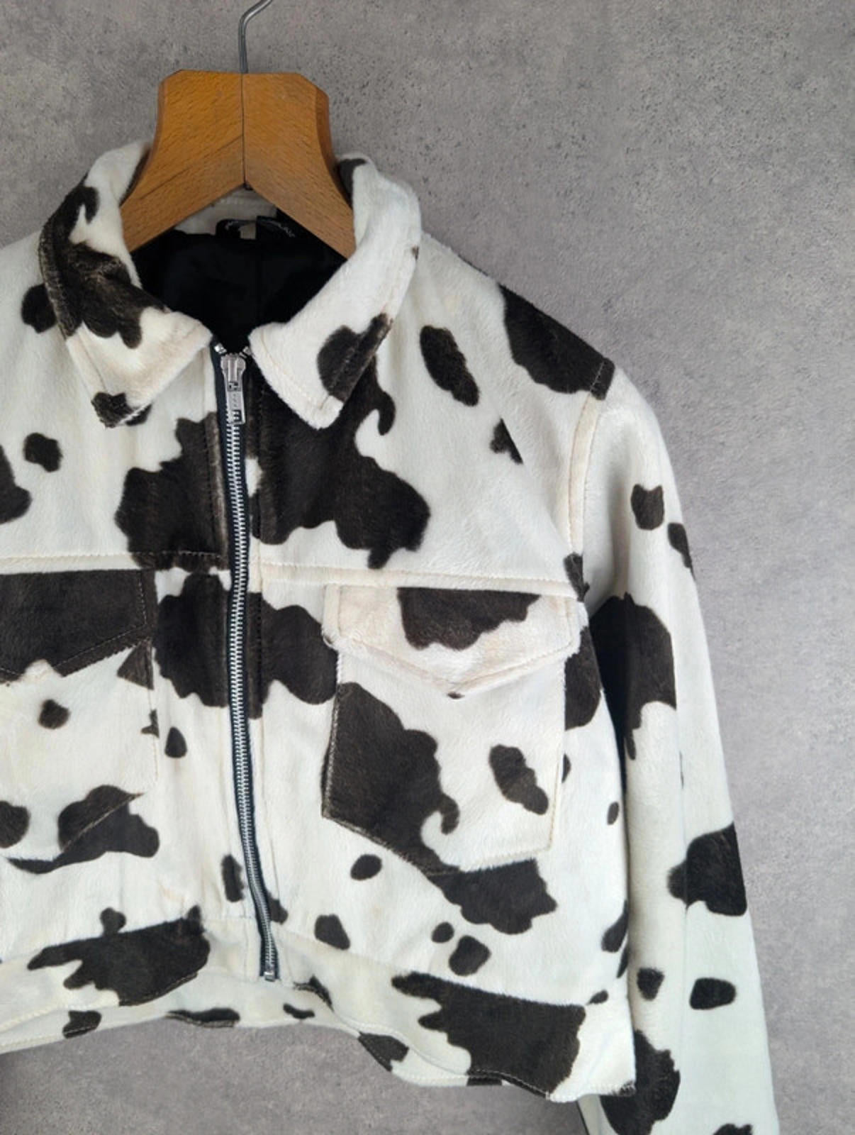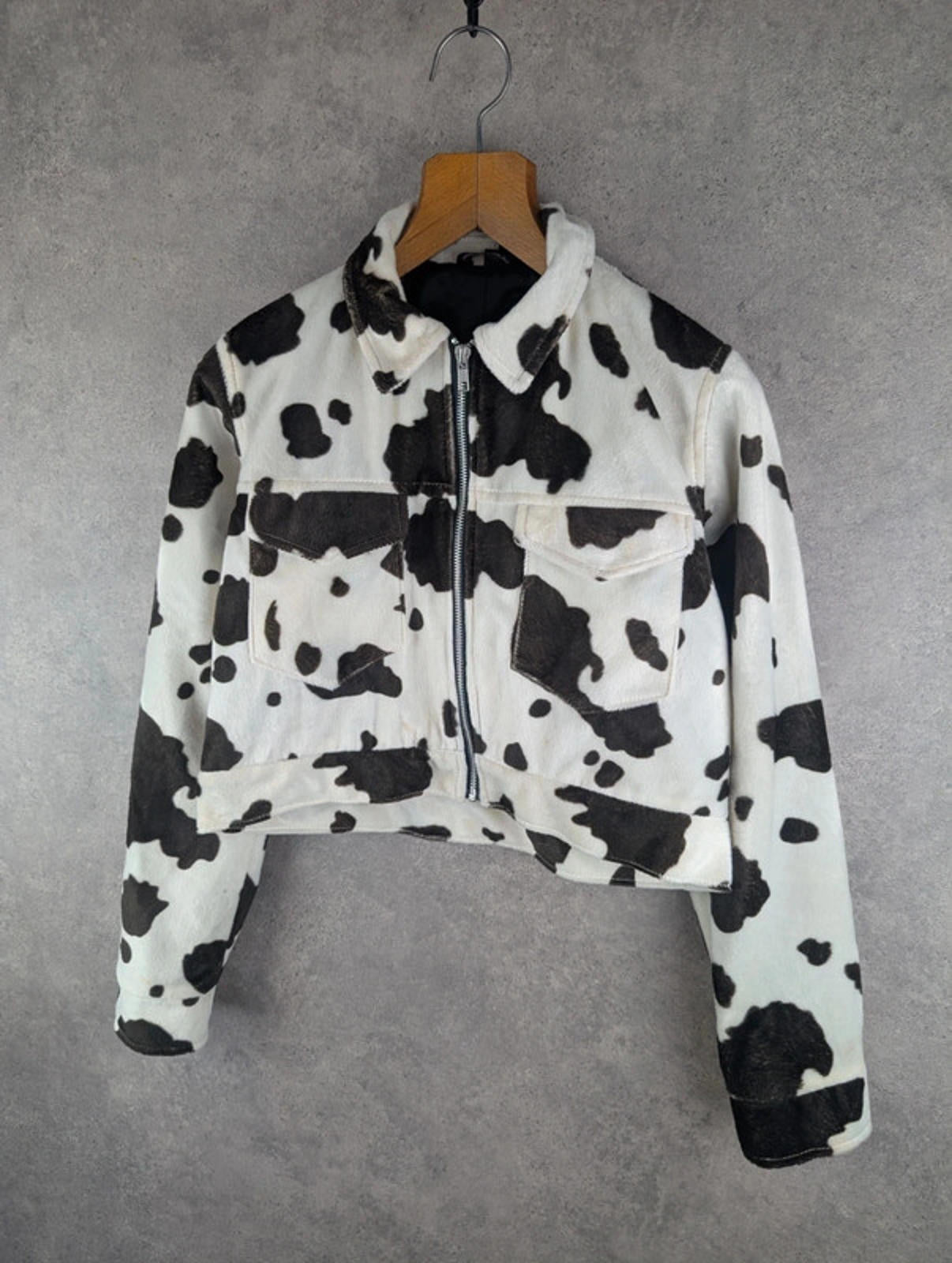 Cow Print Jacket Womens Small S Cropped Vintage Y2K Cropped Full Zip