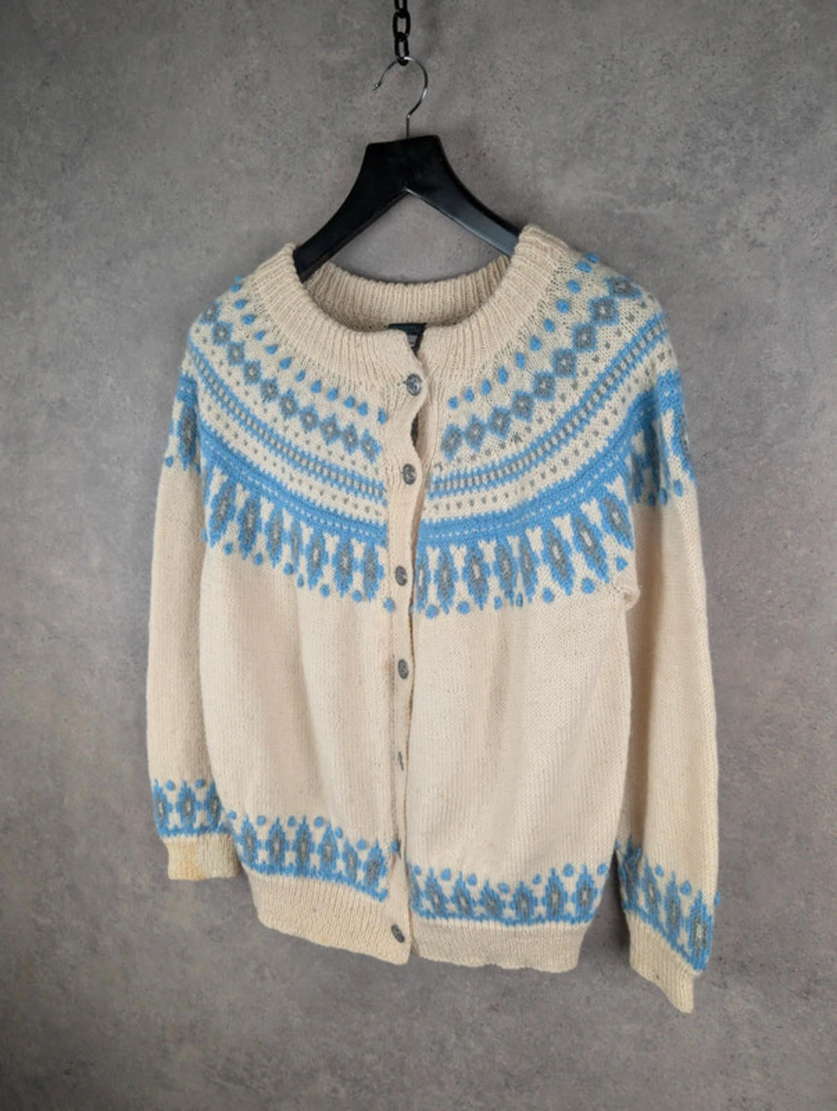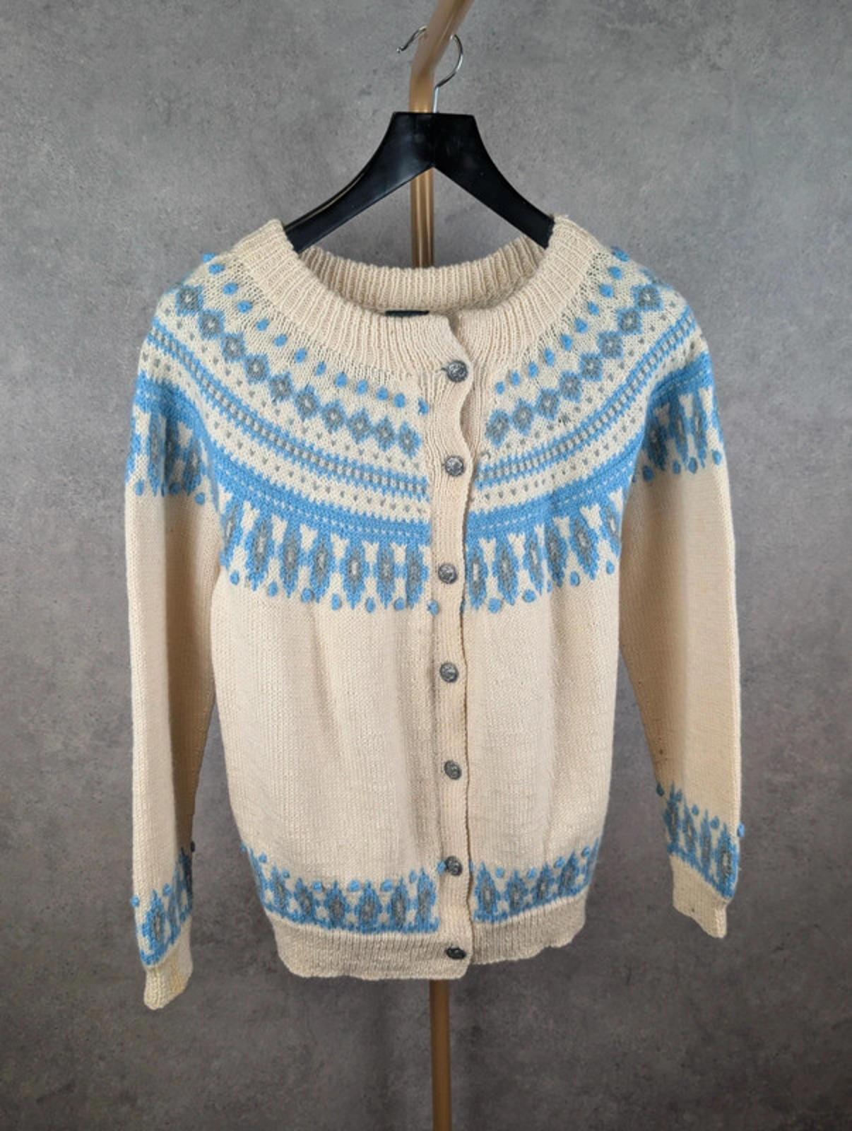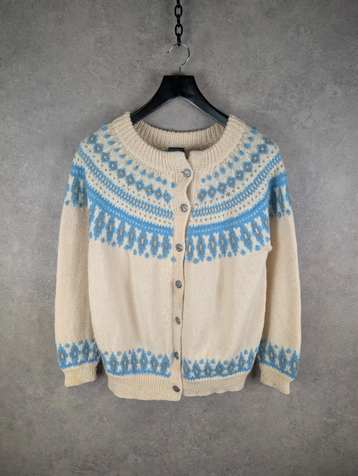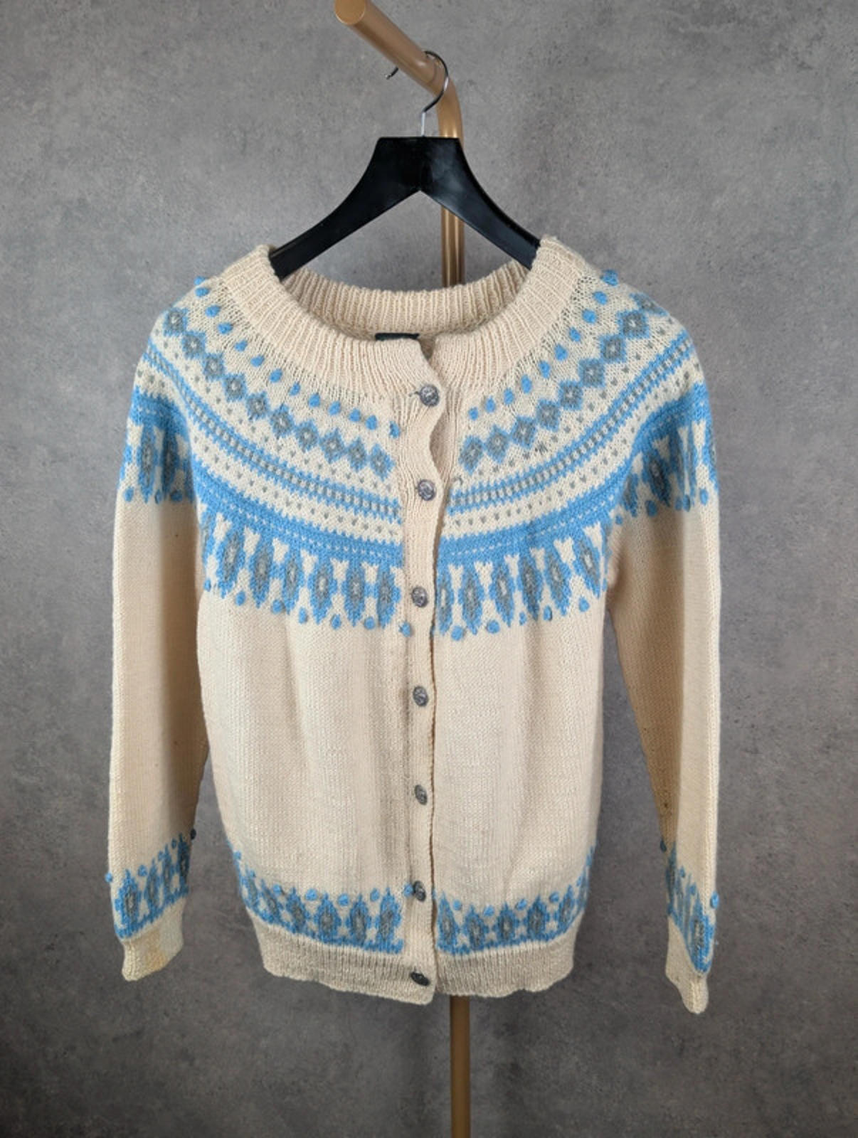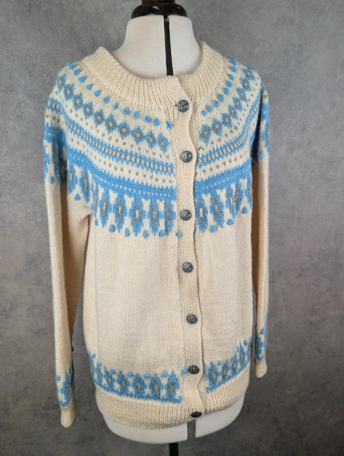 Details: • Brand: Dale of Norway • Size: Women’s Medium • Colour: Cream with blue & grey Fair Isle pattern • Style: Button-up knitted cardigan • Material: 100% Pure New Wool • Made in Norway 🇳🇴 • Features: Traditional Nordic design, ribbed cuffs & hem, decorative metal buttons
