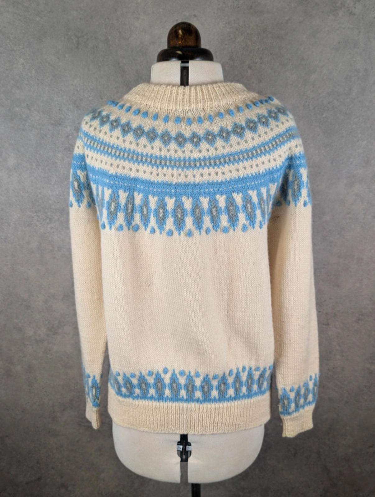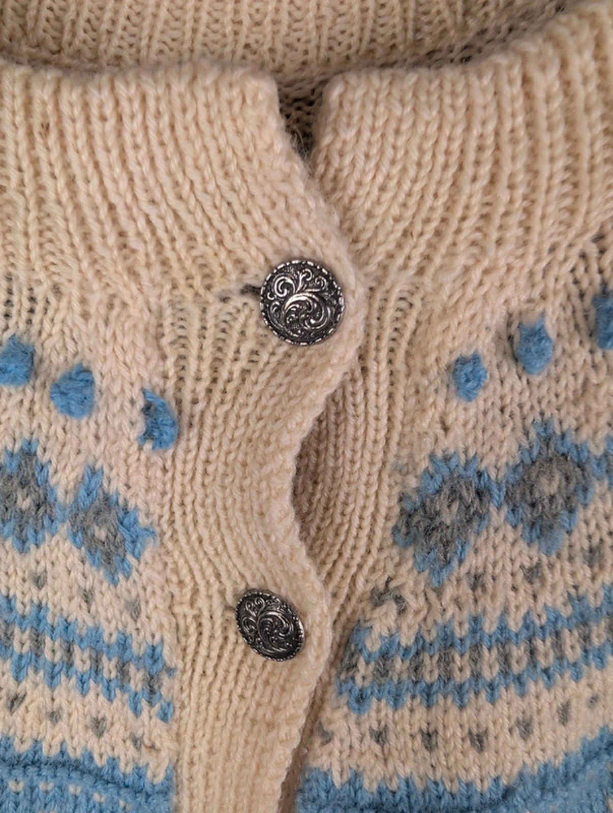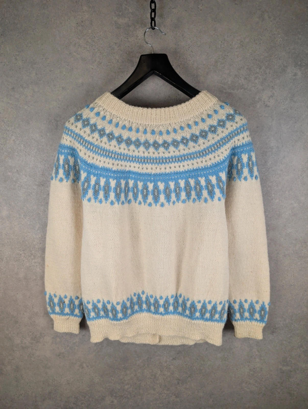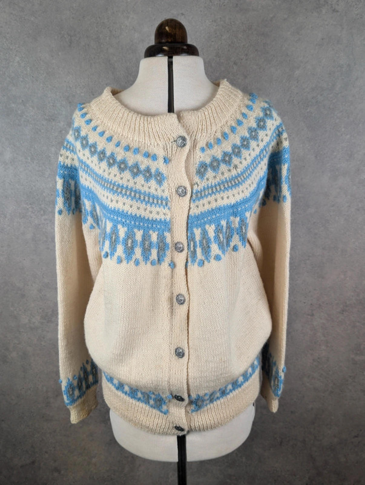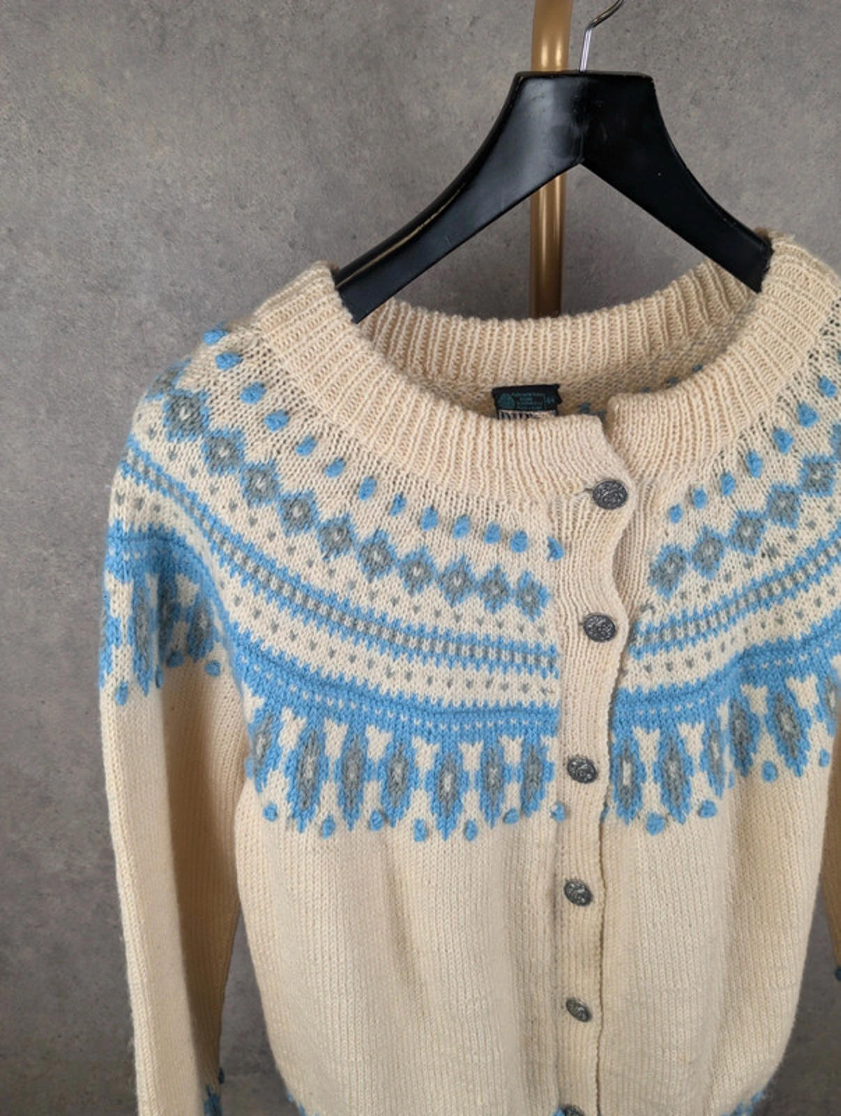 Details: • Brand: Dale of Norway • Size: Women’s Medium • Colour: Cream with blue & grey Fair Isle pattern • Style: Button-up knitted cardigan • Material: 100% Pure New Wool • Made in Norway 🇳🇴 • Features: Traditional Nordic design, ribbed cuffs & hem, decorative metal buttons