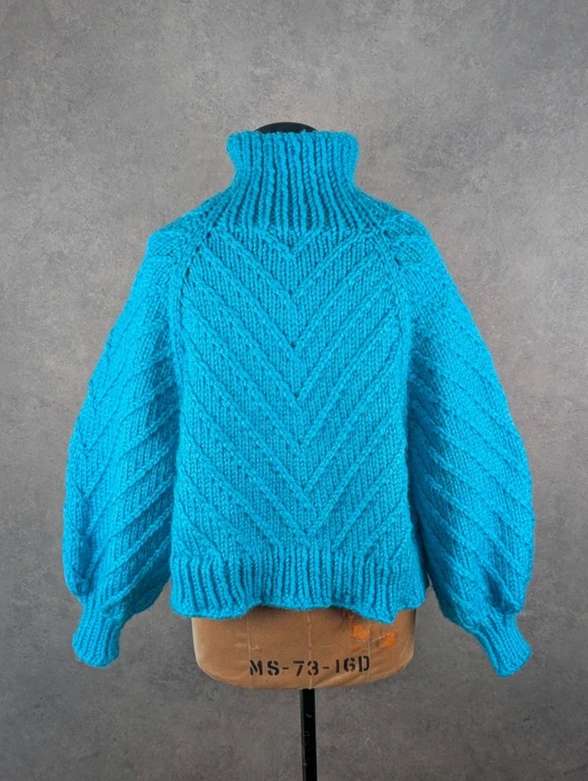 Style: Chunky knit pullover High neck / funnel neck design Hand-knitted construction Textured chevron knit pattern Ribbed cuffs and hem Soft, heavyweight feel Pre-loved in good condition