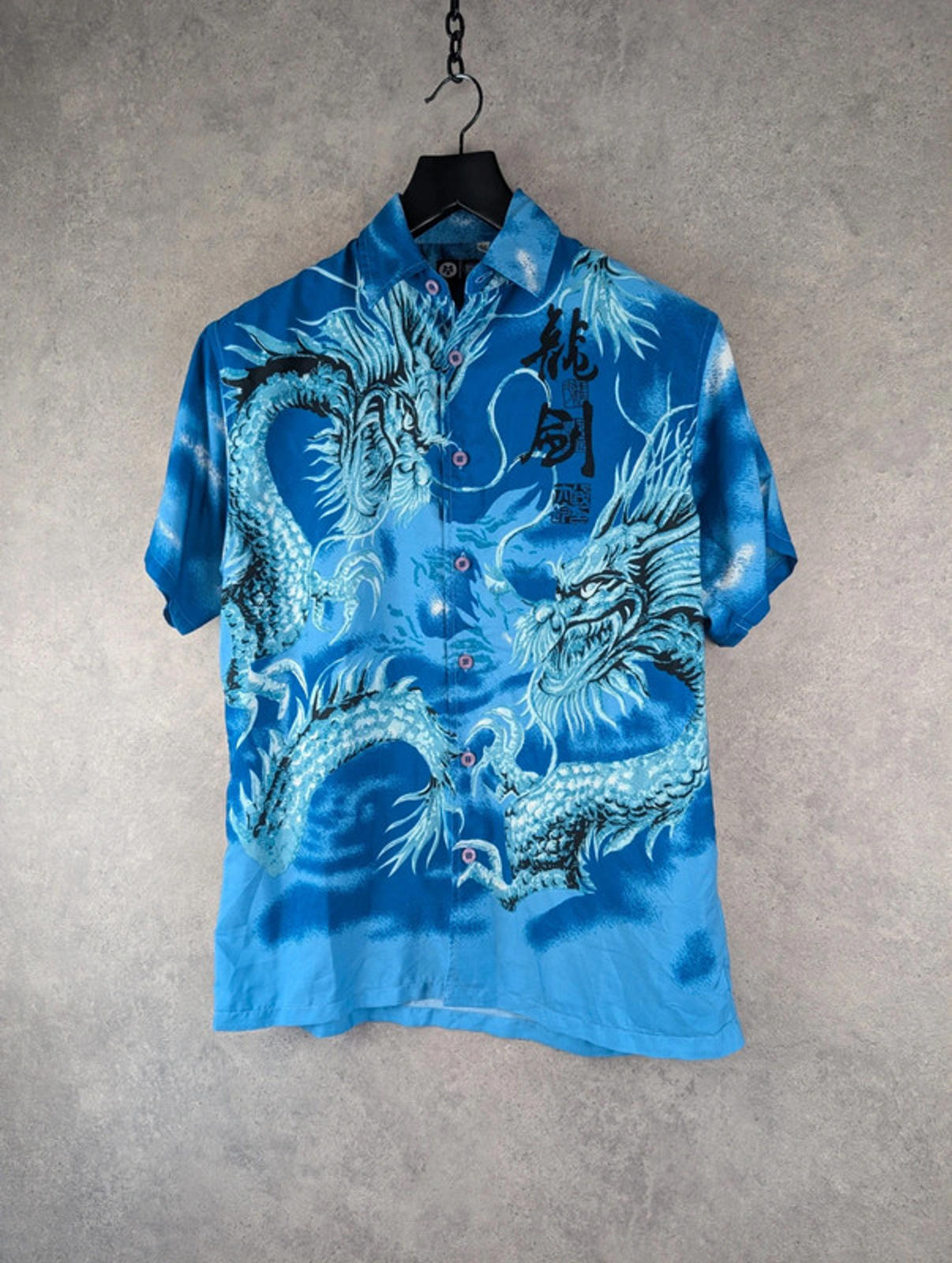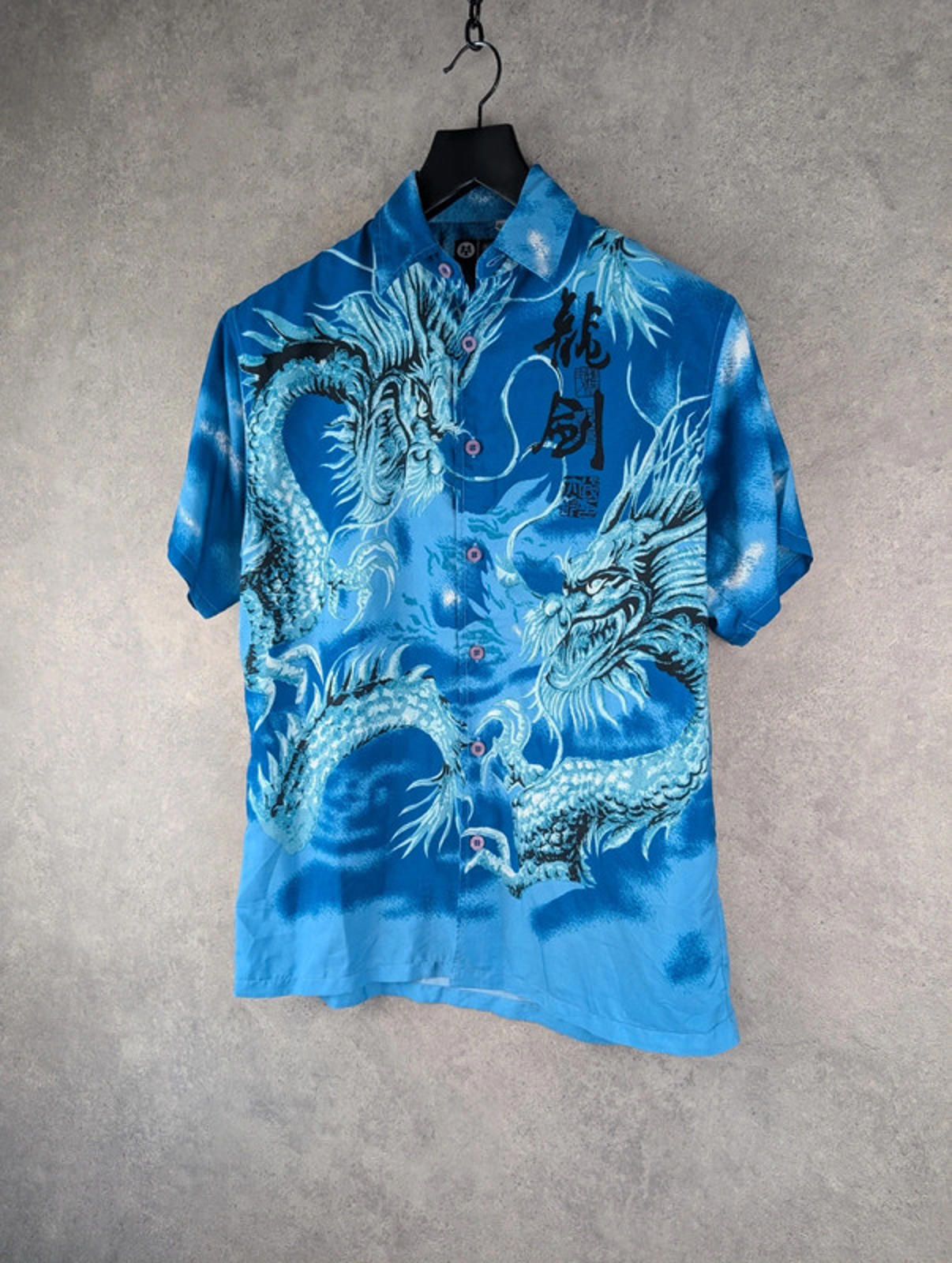 Here & There Dragon Print Shirt Mens M Medium Dragon Y2K Short Sleeve