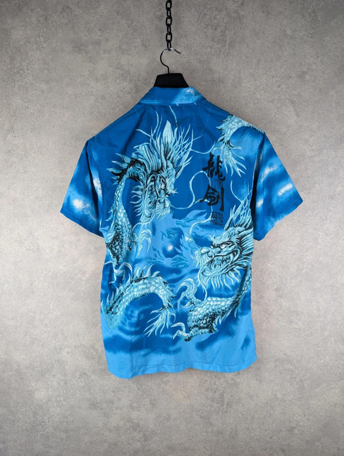 Increase quantity for Here & There Dragon Print Shirt Mens M Medium Dragon Y2K Short Sleeve