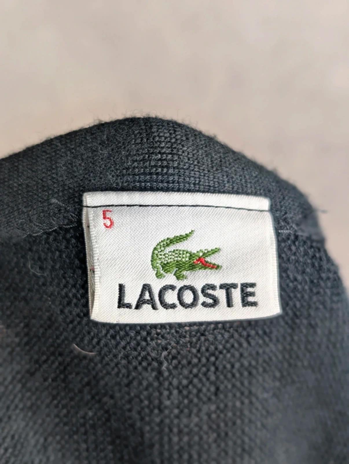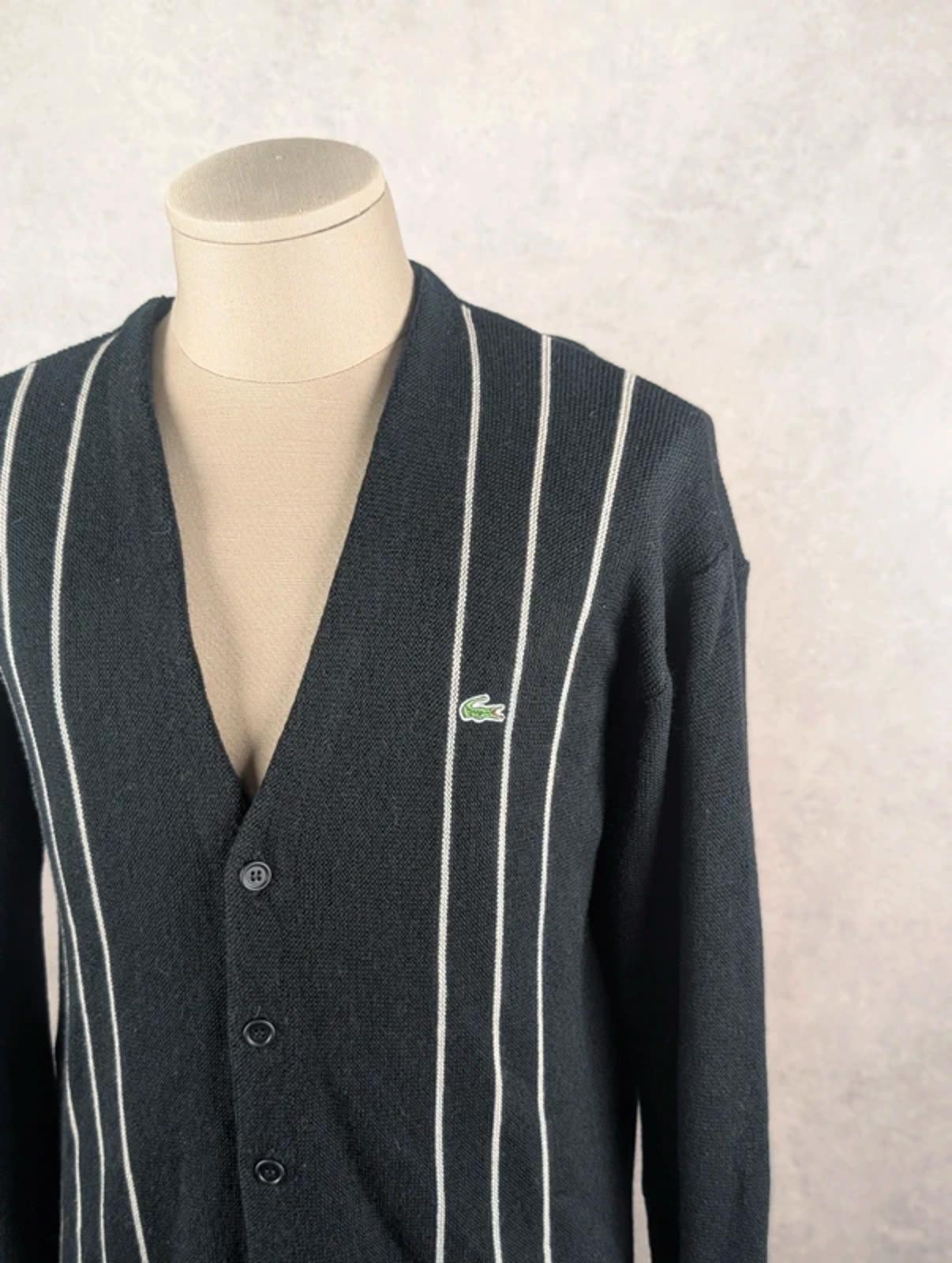 Classic vintage Lacoste cardigan with a timeless, clean-cut look. This men’s cardigan features a deep V-neck, full button-up front, and subtle vertical stripe detailing that gives it a smart yet relaxed feel. Finished with the iconic embroidered crocodile logo on the chest, it’s an easy layering piece that works just as well dressed up or worn casually. A solid vintage staple from Lacoste.