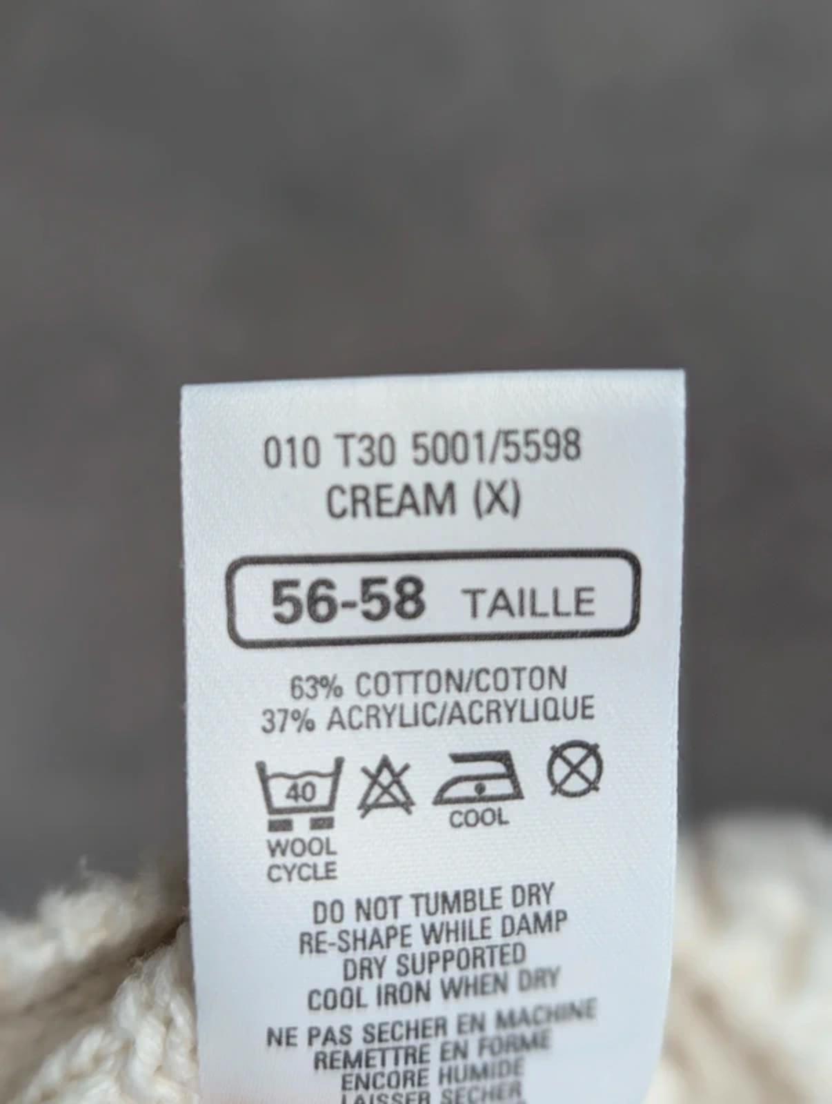 Cable knit construction Long sleeves Ribbed collar, cuffs, and hem Contrast striped neckline Pre-loved in good vintage condition