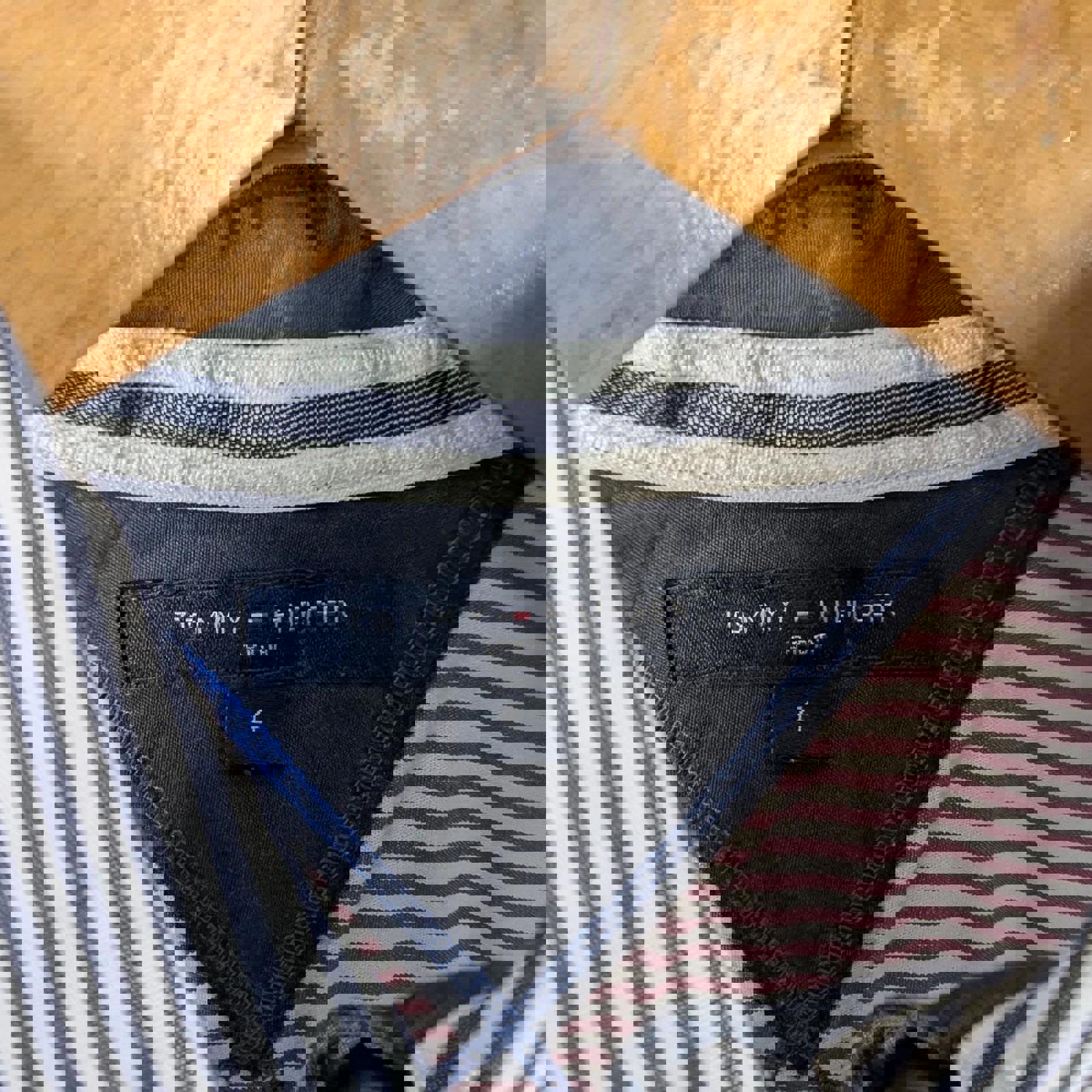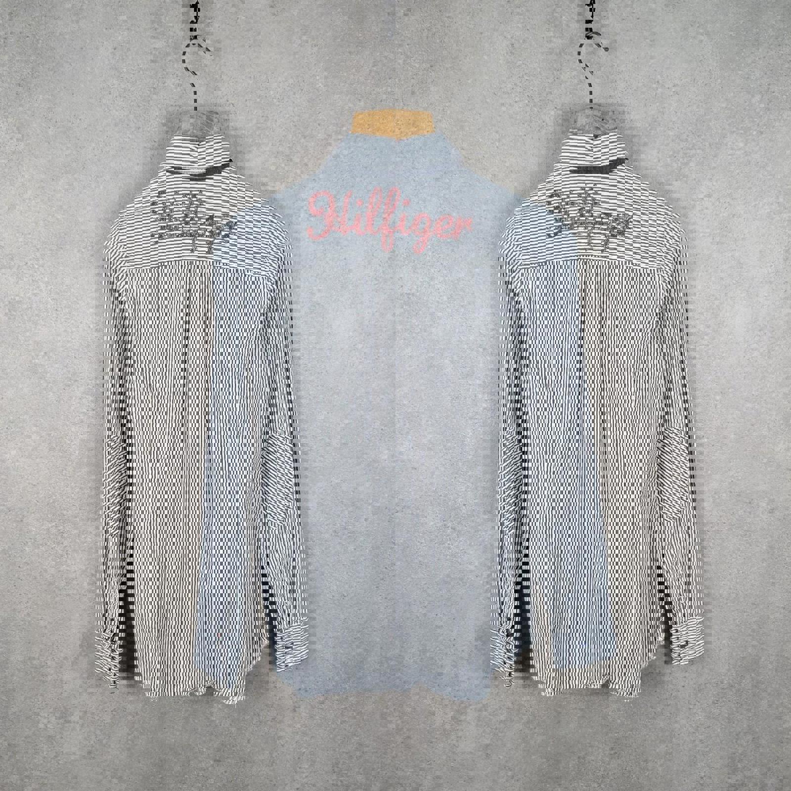 Details: Brand: Tommy Hilfiger Size: Womens 14 Colour: White / Grey Stripe Style: Long Sleeve Shirt / Blouse Features: Button-up front, striped pattern, embroidered chest logo