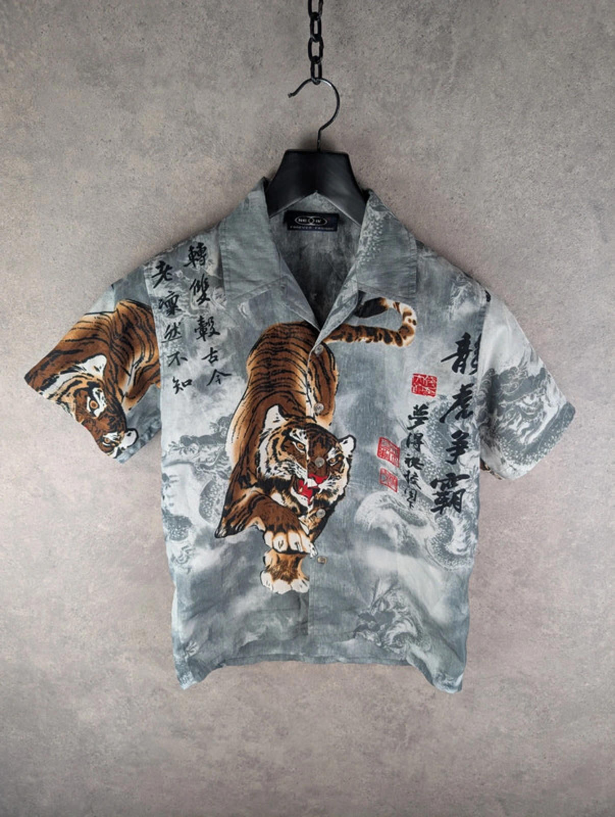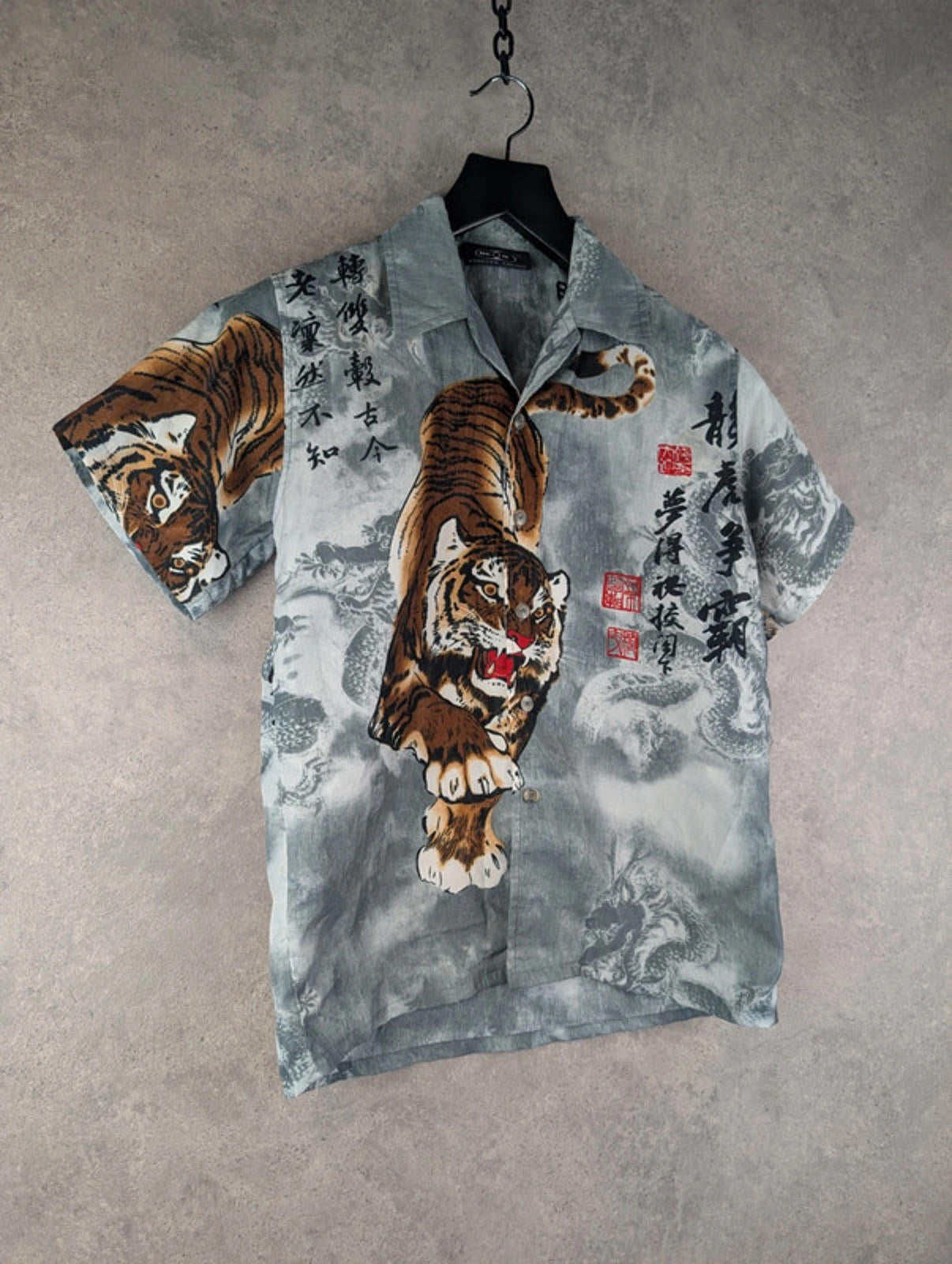 Y2K Tiger Graphic Print Shirt Mens S Small Grey